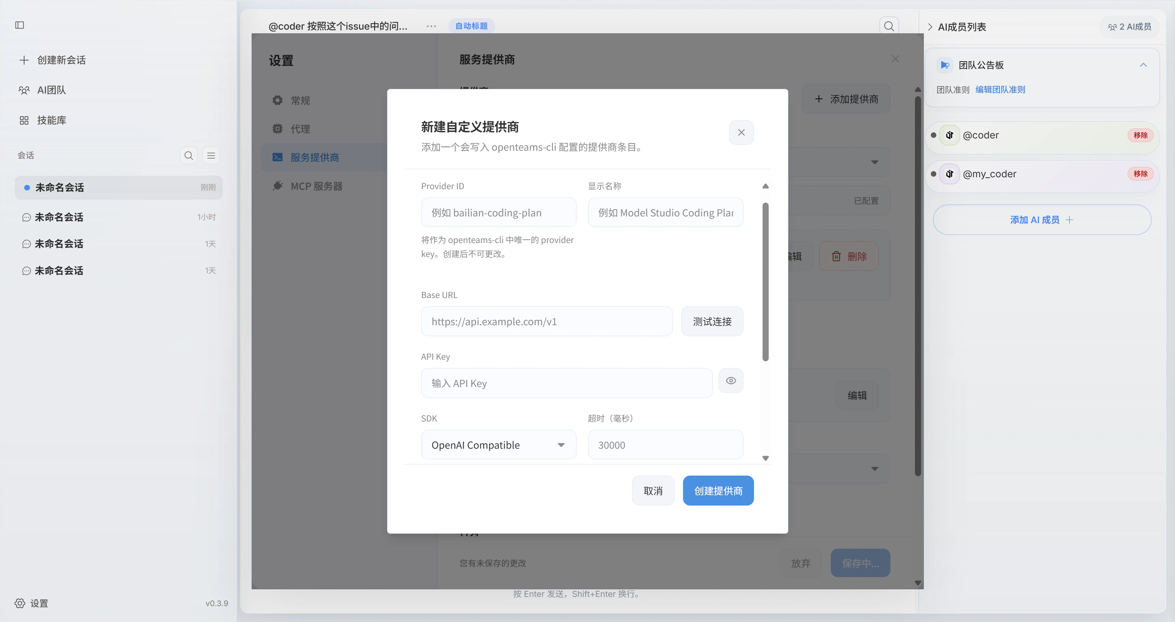 In the top-right area of the service provider settings page, click Add Provider, then fill in the provider ID, provider name, Base URL, API key, and SDK.