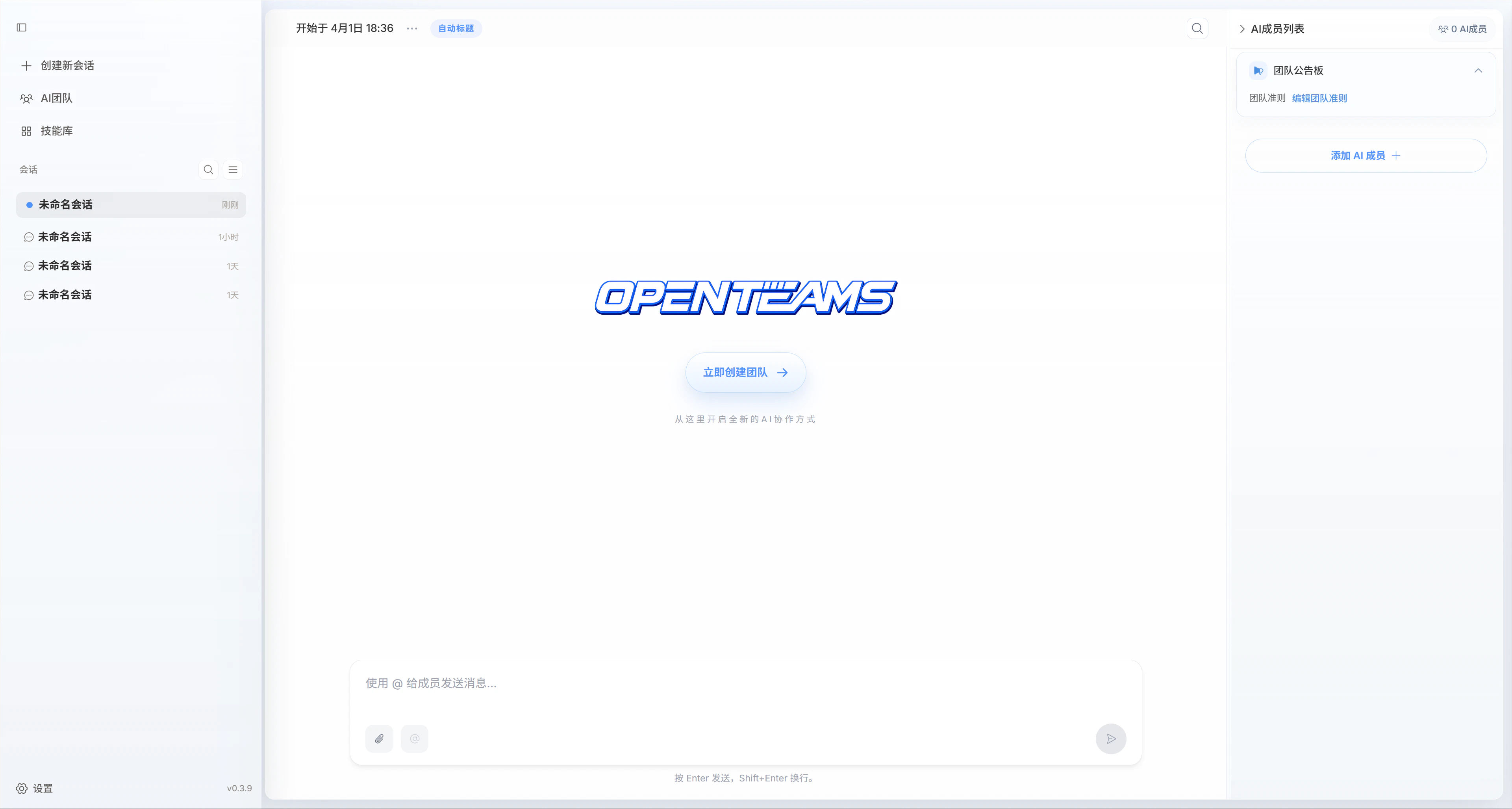 openteams是一个开源通用多智能体协作应用,以群聊为核心交互形态,支持用户创建和指挥自己的AI团队来完成各类任务。 openteams内置openteams-cli Agent,也支持多种本地Agent,如Claude Code、Codex、OpenCode等; openteams支持创建或导入AI成员,您能为他们配置不同的模型和技能。openteams将帮助您组建起一只AI小队,满足复杂任务的执行需求。为什么选择 openteams